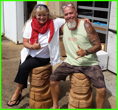 Jill Marie with Tiki Carver Bill Collins of Kauai (Tiki Stools in Kitchen) Finished product in my kitchen. Very inspirational while mixing tropical concoctions.