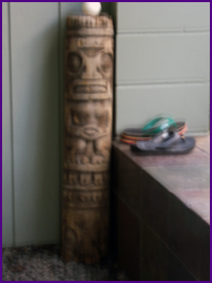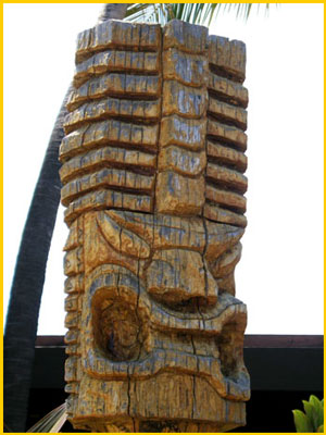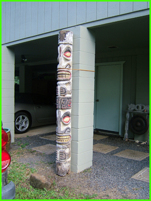 Al Kaku's best side at Pu`uhonua o Honaunau National Historical Park known to tourists as the City of Refuge on the Big Island of Hawaii. Photo by by Lou Kaku.   Tiki attached to a house...somewhere in Hanalei, Kauai Photo by The Tiki Goddess