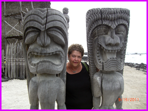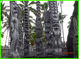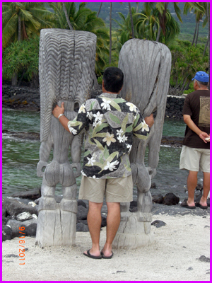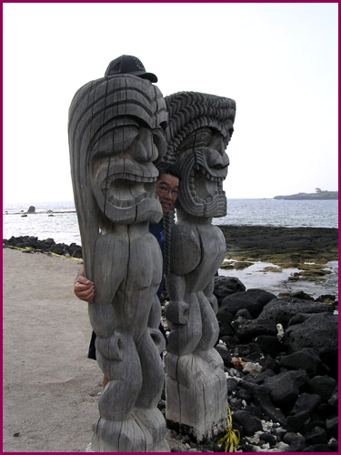 Lou Kaku with two now famous tiki from Pu`uhonua o Honaunau National Historical Park, known to tourists as the City of Refuge on the Big Island of Hawaii. Photo by Al Kaku.   A Tiki Gathering Pu`uhonua o Honaunau National Historical Park, aka the City of Refuge on the Big Island of Hawaii. Photo by Al Kaku